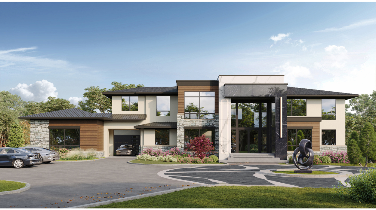 The front elevation rendering focused on a revised entry design requested by the homeowner. Porcelain cladding was rebalanced to create contrast, placing bright white Carrera marble–style porcelain on one side and charcoal porcelain on the other.