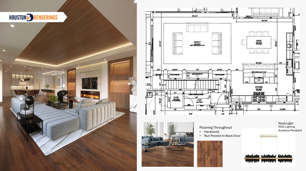 With no room for assumptions, the builder needed a way to fully visualize both the interior and exterior of the home, align expectations with the homeowner, and finalize materials with confidence. That’s where Houston 3D Renderings came in.