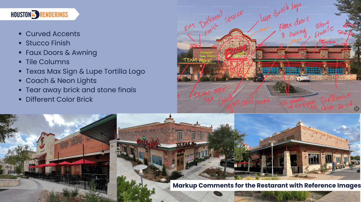 To help Peter fully visualize the renovated restaurant, we crafted a series of design narratives, each one exploring how texture, color, and architectural accents could reshape the building’s identity. Rather than simply producing a straight-on front elevation, we transformed the rendering into a storytelling tool, allowing him to emotionally connect with the direction of his future space.