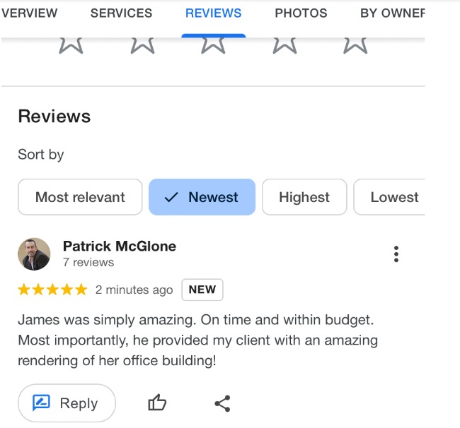 Patrick’s feedback reflects the impact of our work: “James was simply amazing, on time and within budget. Most importantly, he provided my client with an amazing rendering of her office building.” This review highlights how 3D renderings can make a significant difference, ensuring that every detail meets the client’s vision and expectations.